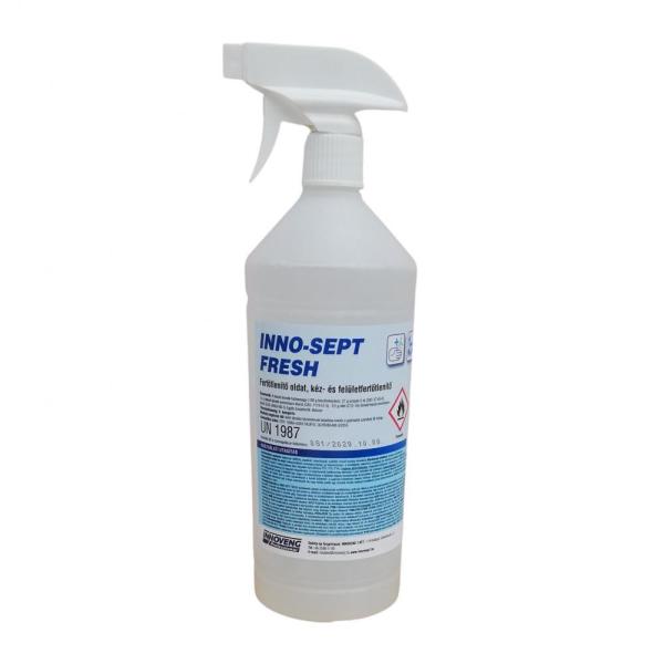 Antimikrobiális spektrum: baktericid (MRSA), yeasticid, tuberkulocid, szelektív virucid (burkos vírusokra) Alkalmazási feltételek: töményen kell alkalmazni. Felhasználás területe és módja: Felhasználható a közegészségügy, az élelmiszeripar, a vendéglátás valamint a szolgáltató ipar különböző területein foglalkozásszerű felhasználók részére. Felhasználásra kész folyadék (terméktípus PT1, PT2, PT4). Higiénés kézfertőtlenítés: Juttassunk a tenyérbe kb. 3 ml INNO-SEPT FRESH fertőtlenítő oldatot, majd alaposan dörzsöljük be a keveréket 30 másodpercig és hagyjuk megszáradni. A tuberkulocid hatékonyság elérésére 1 perc behatási idő szükséges. Felületfertőtlenítés: Permetezze a keveréket a felületre, vagy a fertőtlenítőszerrel átitatott törlőkendővel kezelje a felületet úgy, hogy a fertőtlenítőszer a felületet teljesen benedvesítse és kezeletlen részek ne maradjanak. Minimális behatási idő: 5 perc. A behatási idő letelte után a szer maradványait a kezelt felületről– a padozat kivételével- alapos ivóvizes öblítéssel kell eltávolítani. Az élelmiszerekkel közvetlenül érintkező felületek esetében az öblítés hatékonyságát ellenőrizni kell. Erősen szennyezett kéz vagy felület esetén egy erősebb tisztító hatással rendelkező szerrel történő kézmosás (MANUELA), illetve felülettisztítás (INNOFLUID-ALK-M) után használjuk fertőtlenítésre a szert.- 1 literes szórófejes flakon Kapcsolódó termék: Szenzoros spray szappan és fertőtlenítőszer adagoló, asztali, beépített akkumlátorral, 450ml