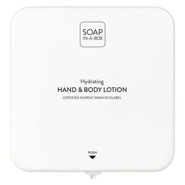 Soap-In-A-Box fényes fehér kéz- és testápoló adagoló, előlap